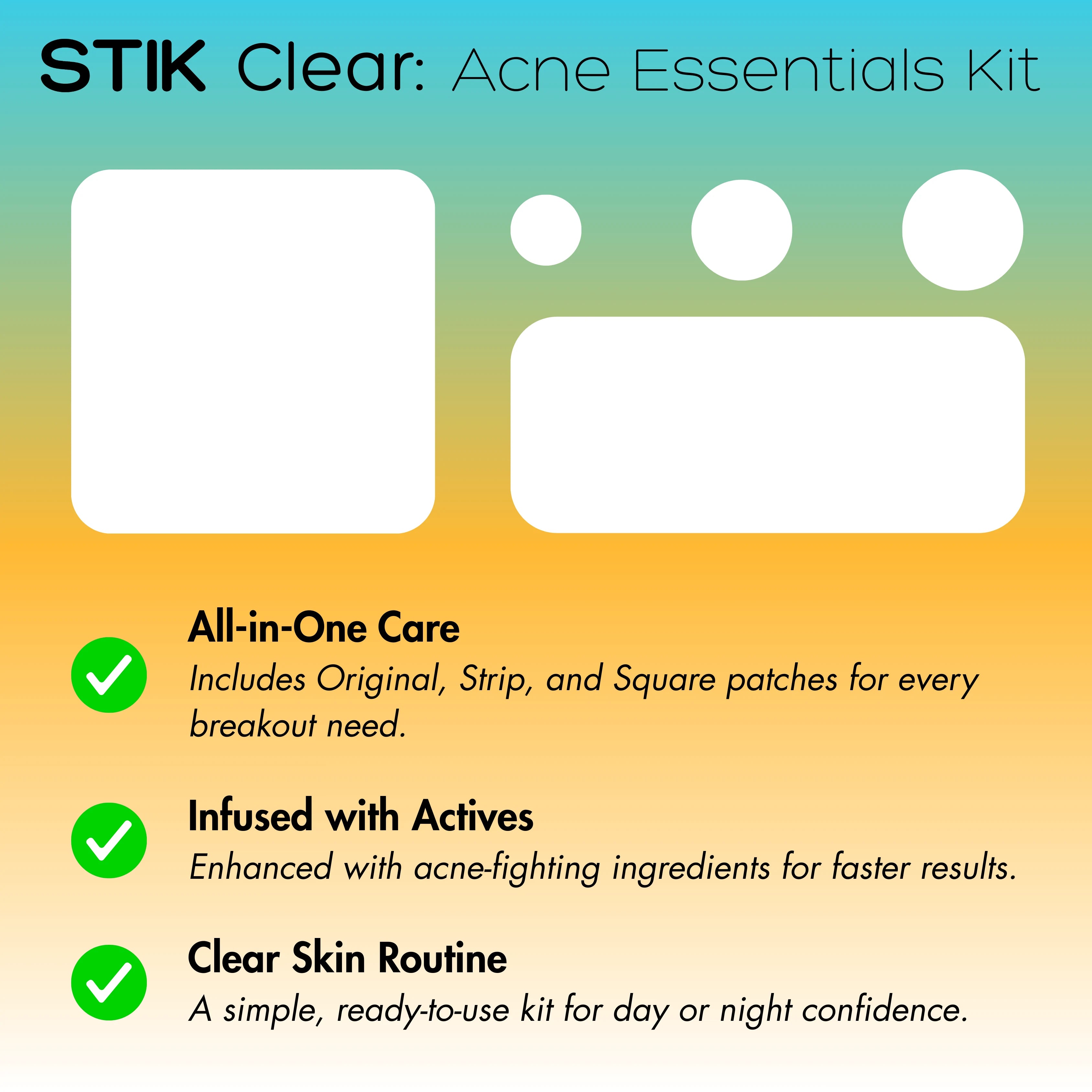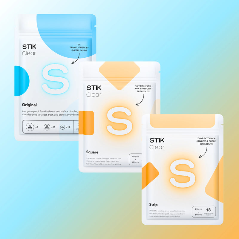 STIK Clear: Acne Essentials Kit provides daily defense with a curated mix of Original, Strip, and Square patches. Cover, protect, and heal blemishes while keeping skin clear and confident.