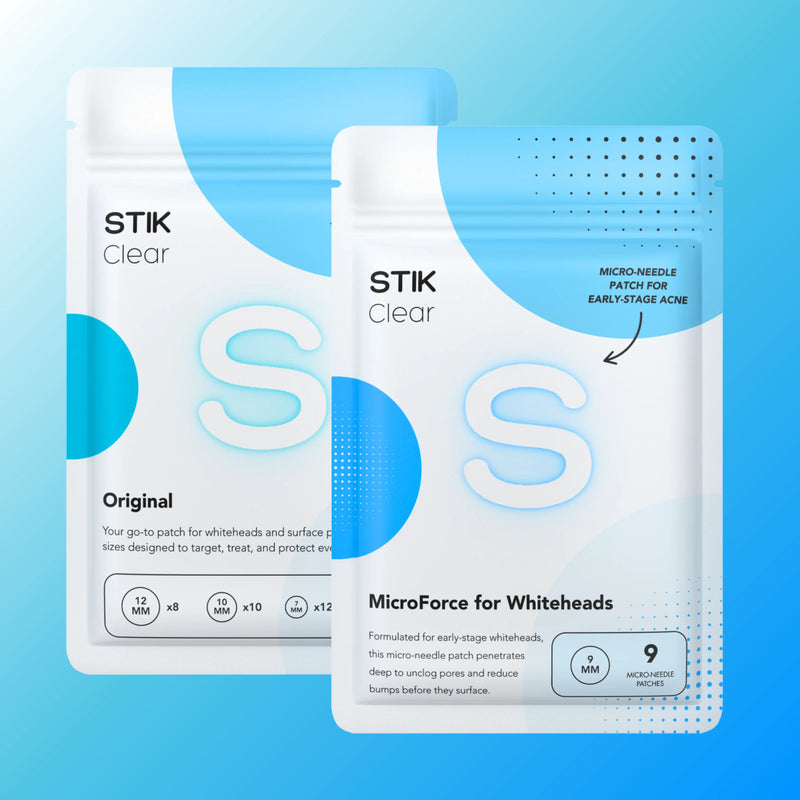 The STIK Clear: Acne Rescue Kit combines our Original hydrocolloid patches with MicroForce micro-needle patches to absorb, calm, and target pimples at the root, helping clear breakouts fast.