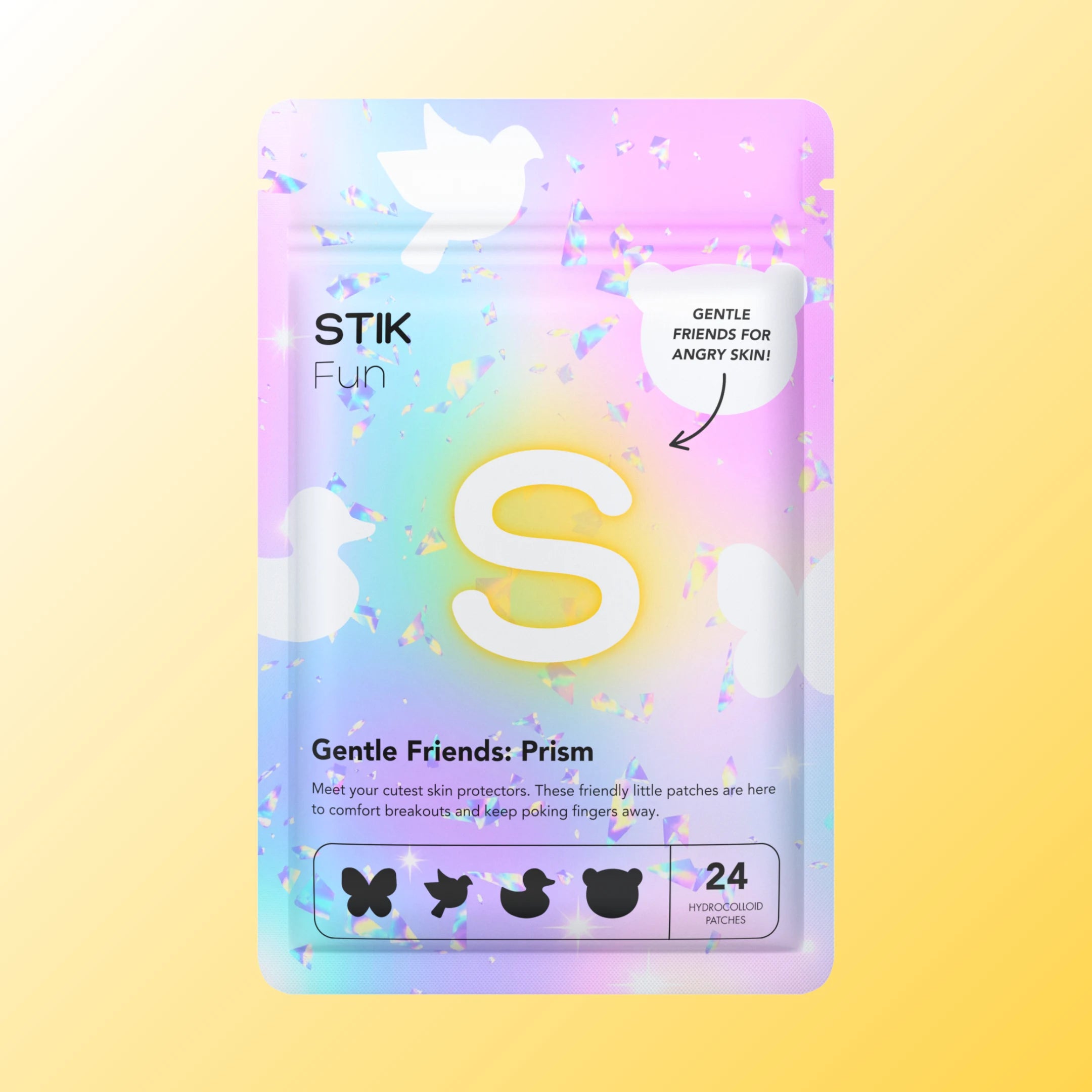 Meet Gentle Friends — hydrocolloid acne patches with an adorable twist. Shaped like ducks, bears, butterflies, and pigeons in holographic patterns, these patches make self-care playful while protecting your skin as it heals. 🦋